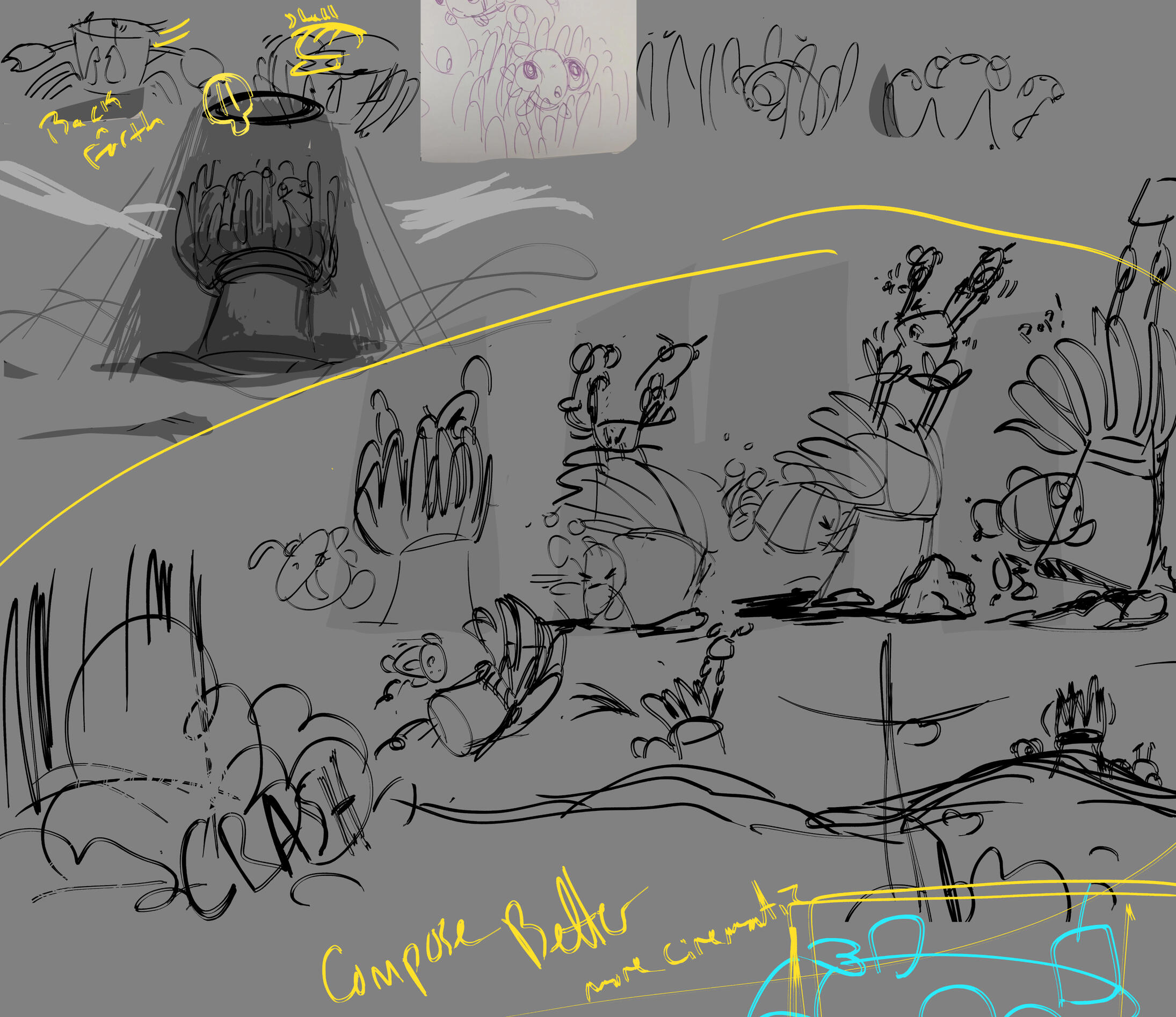 This was my first time boarding something longer than a couple shots. Coming up with ideas is hard!!! I kept falling into the trap of "gotta make this shot perfect" that every time I sat down to board I would get so anxious I just couldn't!But I found a way around it. And that is doodling!By doodling in my sketchbook and just getting random thoughts out for shots, we were able to scrap them all together in sequence and make essentially our "sticky note" pass.